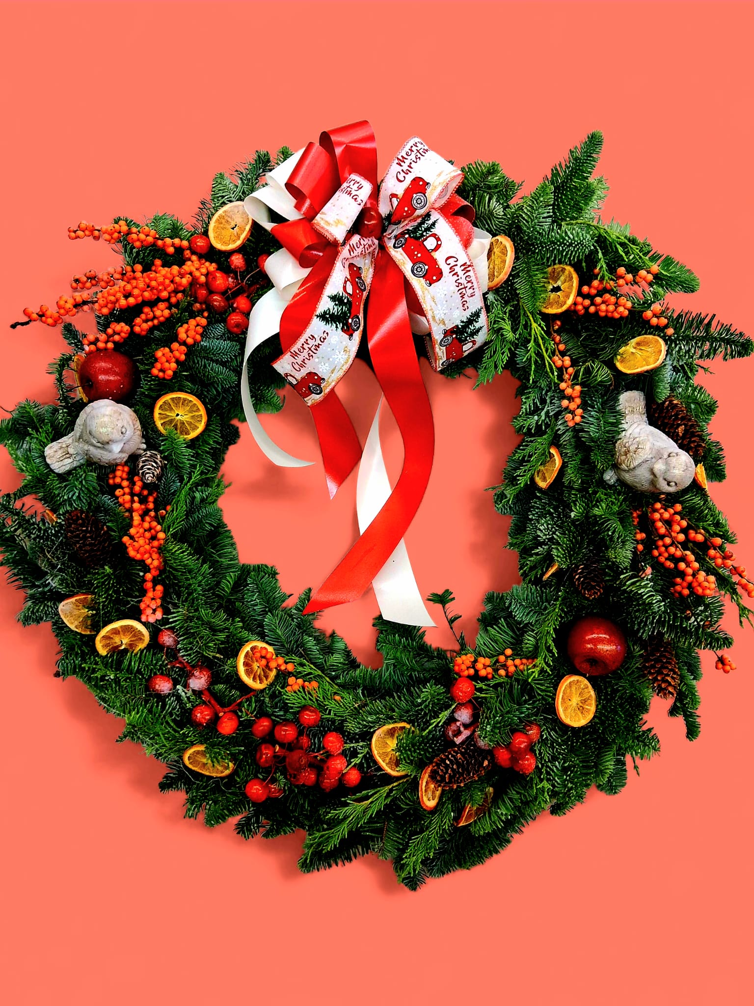 A lovely white-and-red wreath adorned with straw details and cheerful orange fruits πŸŠπŸŽ€.