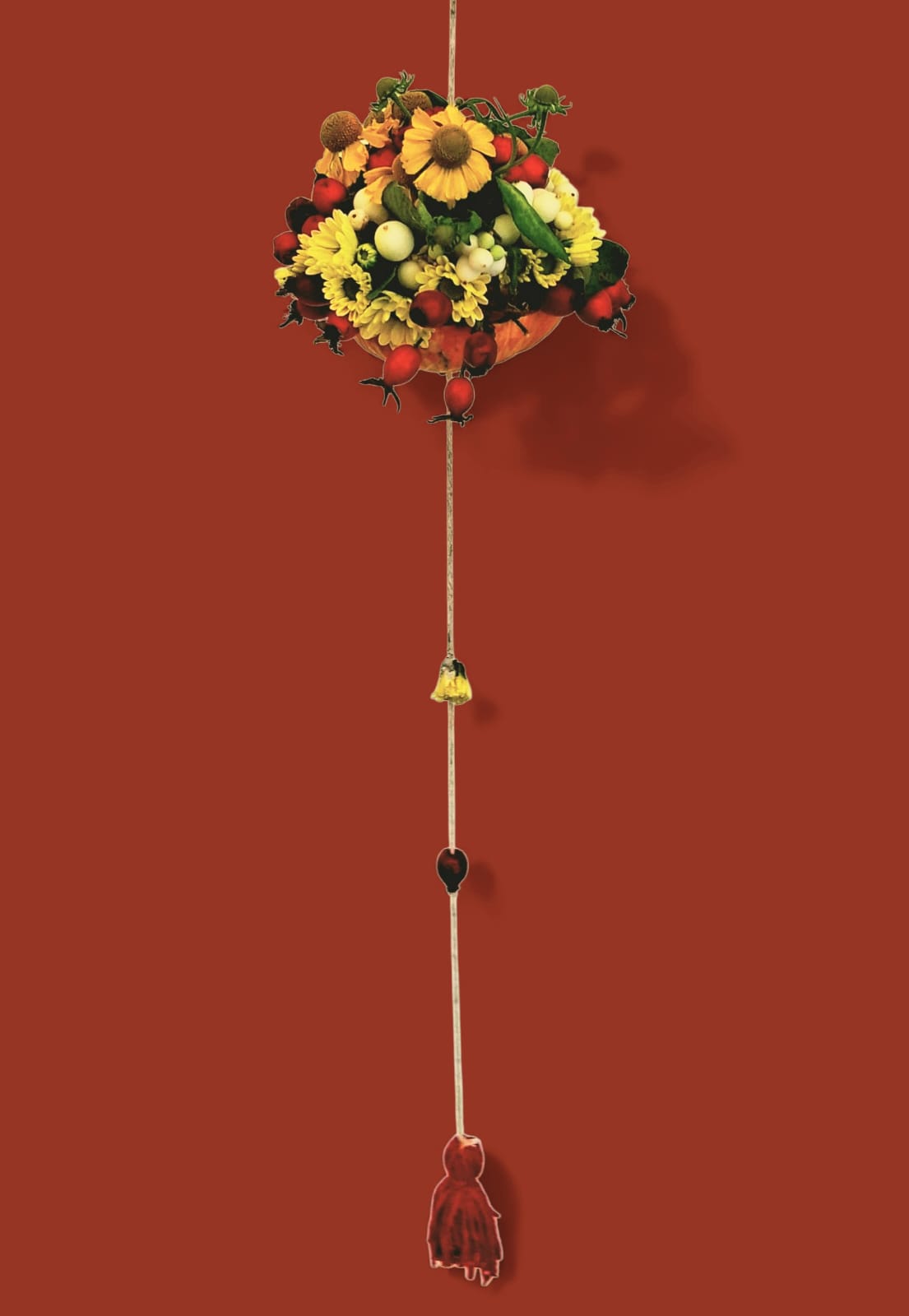 A hanging piece of autumn – flowers, berries, and fruits gathered in a pumpkin, flowing down with tiny charms. Like a seasonal note suspended in midair, simple and playful. 🍁✨