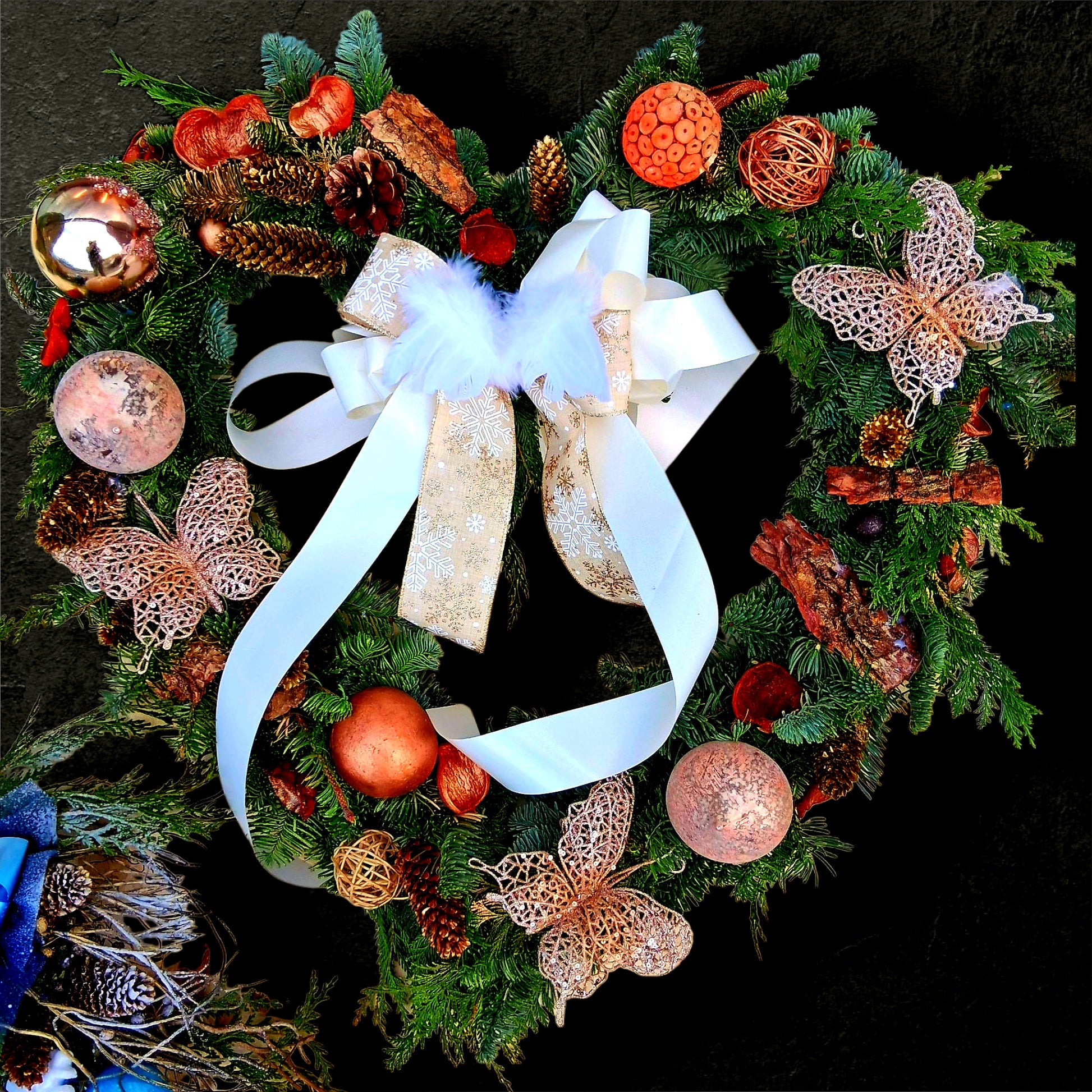 A heart-shaped wreath that feels like a soft hug π€. Made with scented pine π², warm bronze accents π«, and delicate butterflies π¦ tied together with a white satin ribbon π and soft angel wings π. It has a sense of peace βοΈ, light π, and tenderness π about it that is a lovely way to show love β€οΈ and think quietly ποΈ.