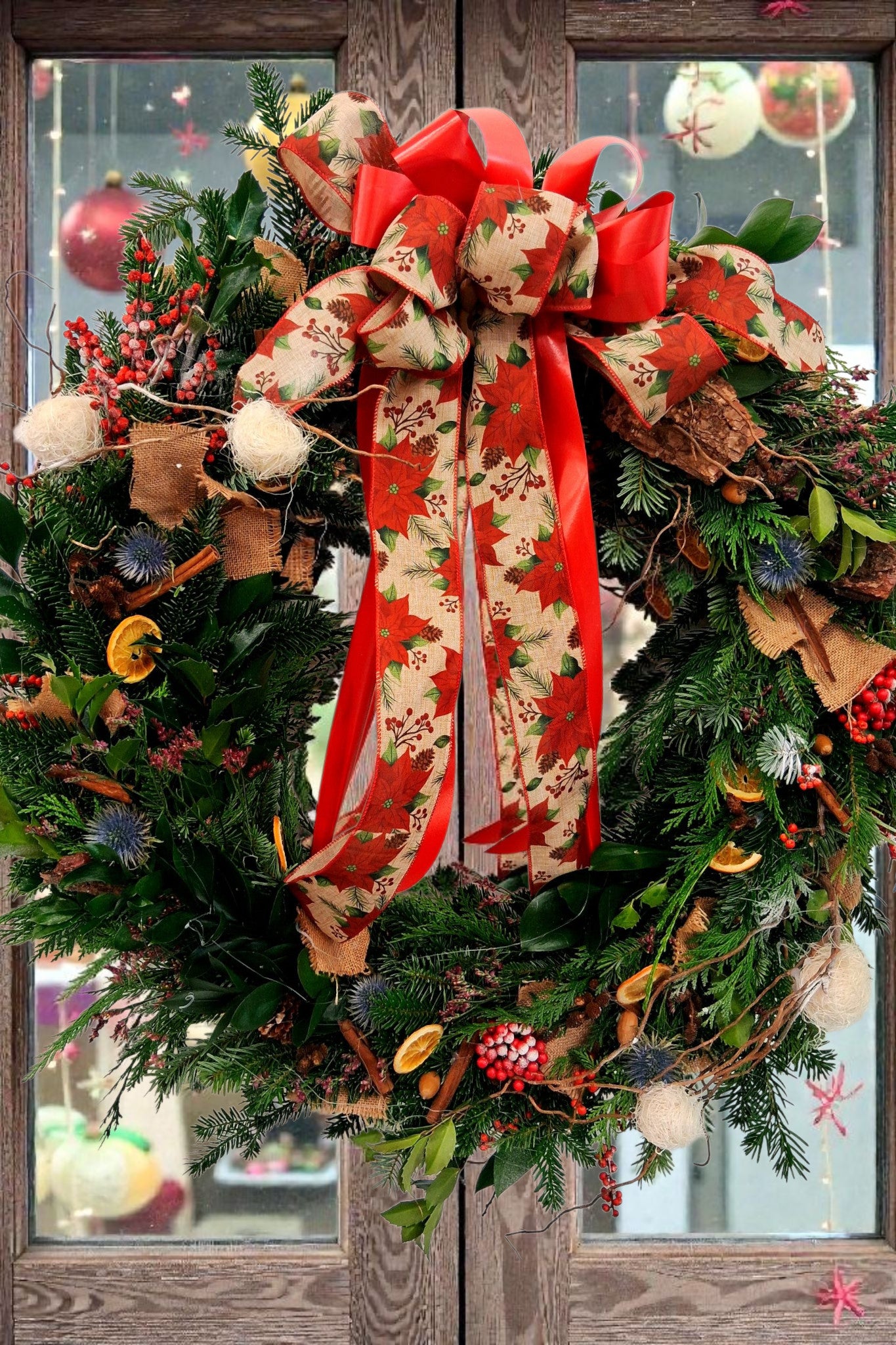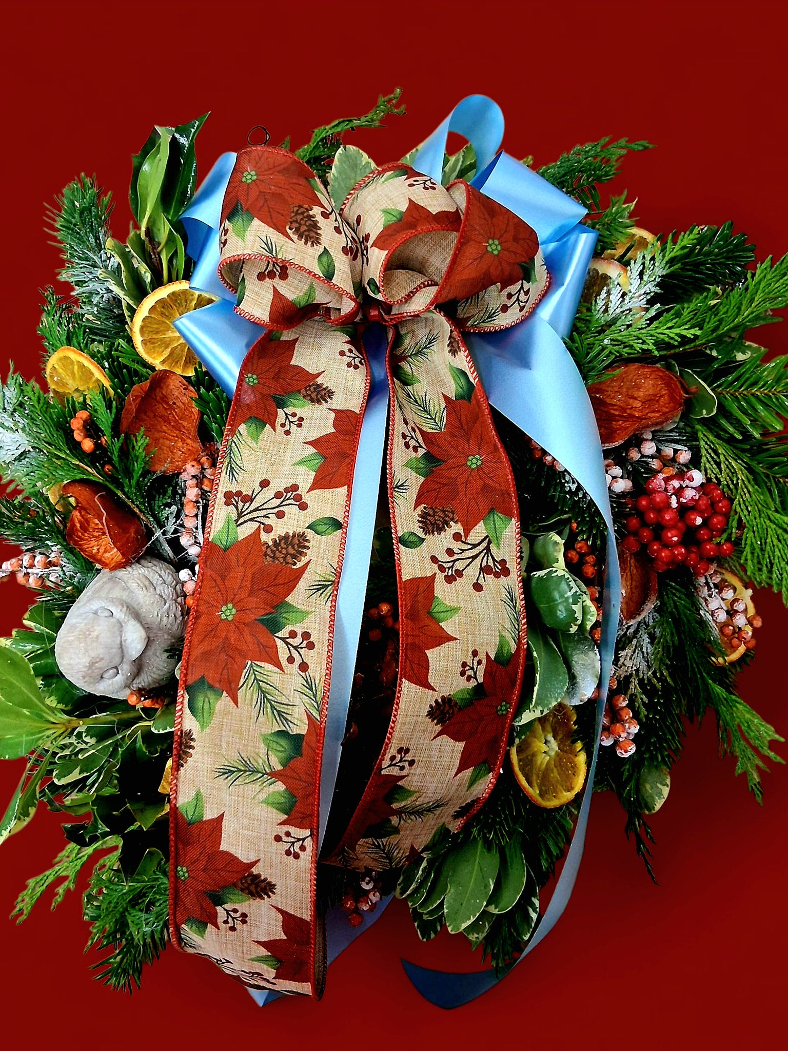 A delightful Christmas wreath brimming with warmth and vibrant colors featuring red poinsettias πΊ, frosted fruits πβοΈ, cinnamon π°, and a cheerful ribbon ποΈ that brings it all together.