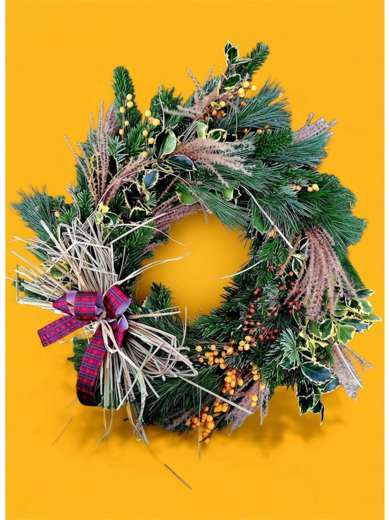 This wreath whispers tales of the wild forest. At its heart is raw from the fluffy grasses that sway in the breeze, to the greenery of pines and holly. Drops of sunshine, captured in bright yellow berries while a touch of Scottish tartan woven through it adds a warm, homely charm.